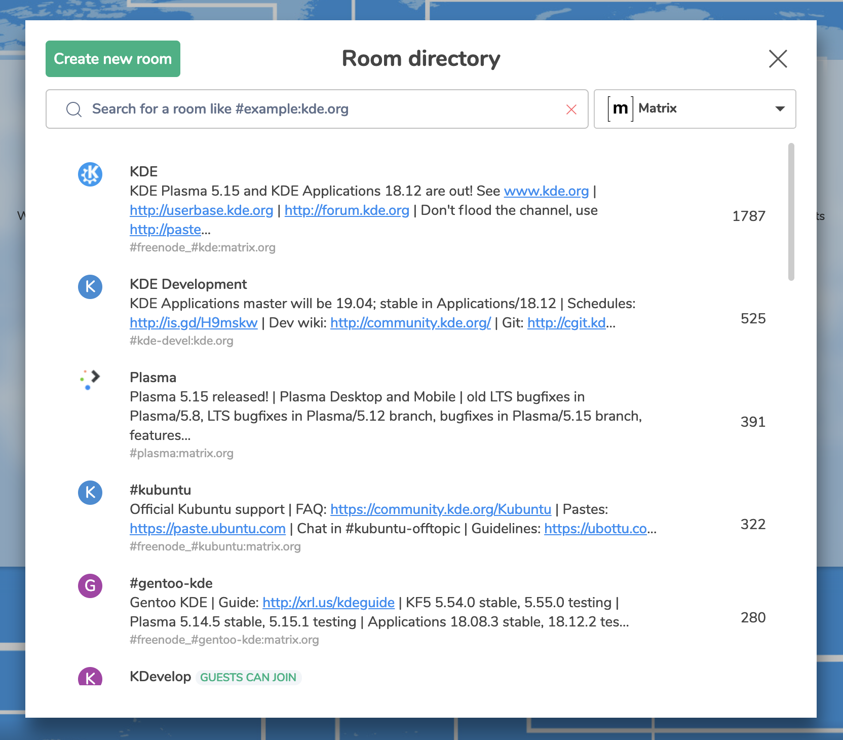 You can see the full announcement and explanation over at https://dot.kde.org/2019/02/20/kde-adding-matrix-its-im-framework.  It is fantastic to see one of the largest Free Software communities out there proactively adopting Matrix as an open protocol, open network and FOSS project, rather than drifting into a proprietary centralised chat system.  It's also really fun to see Riot 1.0 finally holding its own as a chat app against the proprietary alternatives!