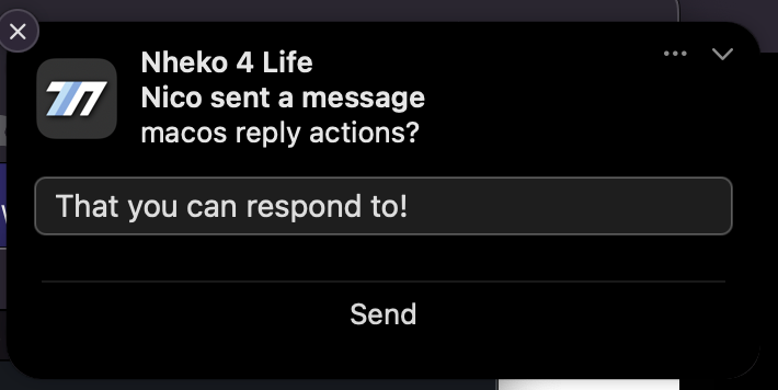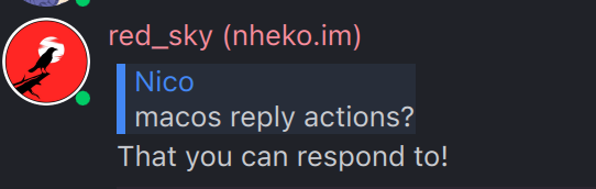 You can now respond to notifications on macOS in nheko! These will be sent as a rich reply. No need to open up the main client any more to respond to folks.