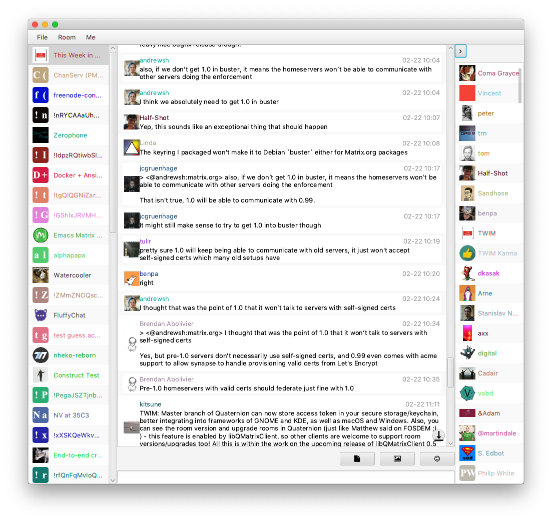 Quaternion is now officially at version 0.0.9.4! Optional native scrollbar for the timeline, files uploading, initial support of matrix.to links (the foundation for future Matrix URIs), first complete translations, and much much more - the long list is here: https://github.com/QMatrixClient/Quaternion/releases/tag/0.0.9.4. Packagers are advised to take a look at the building and packaging section of the release notes: there are a few updates for you there.