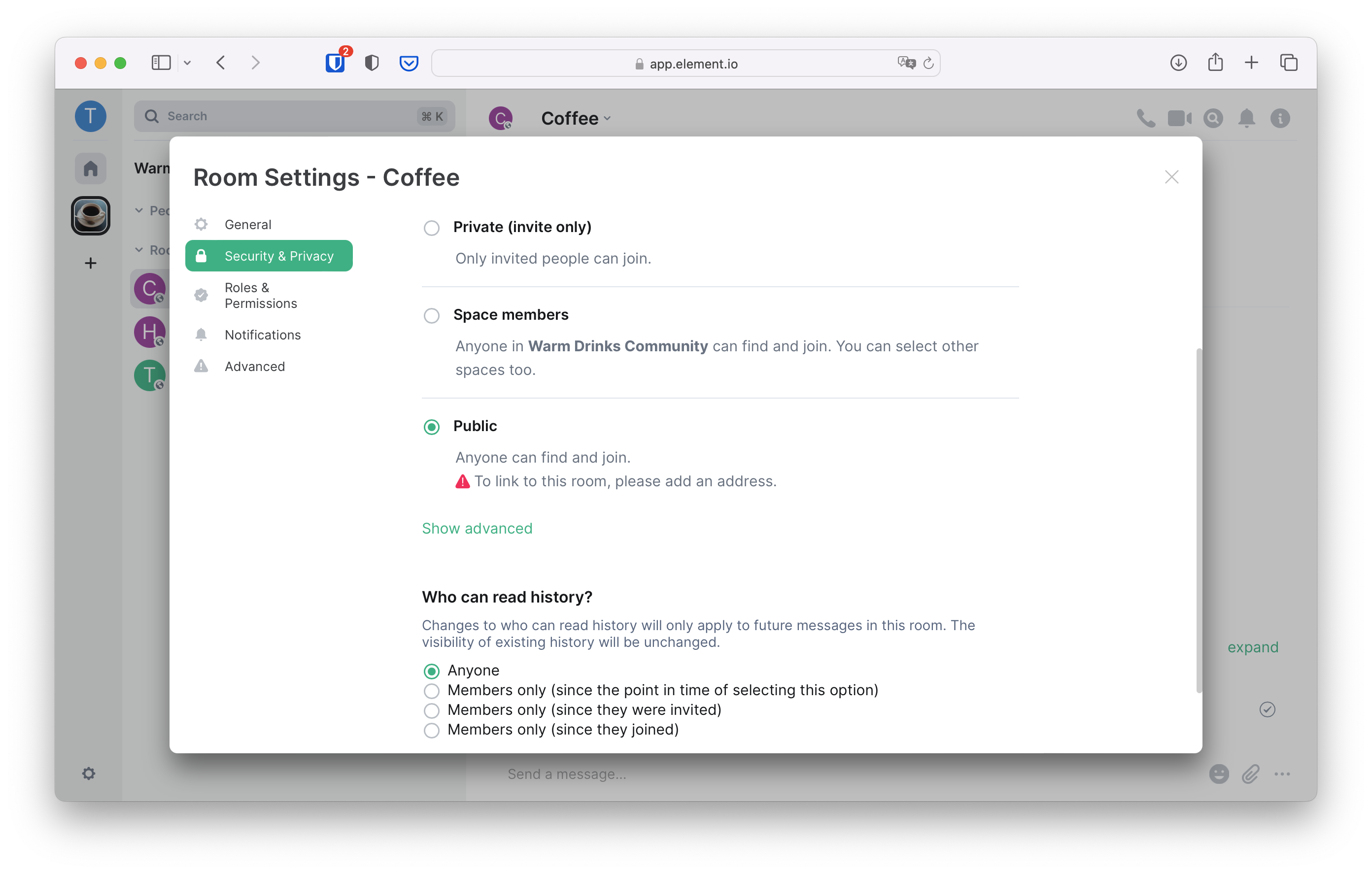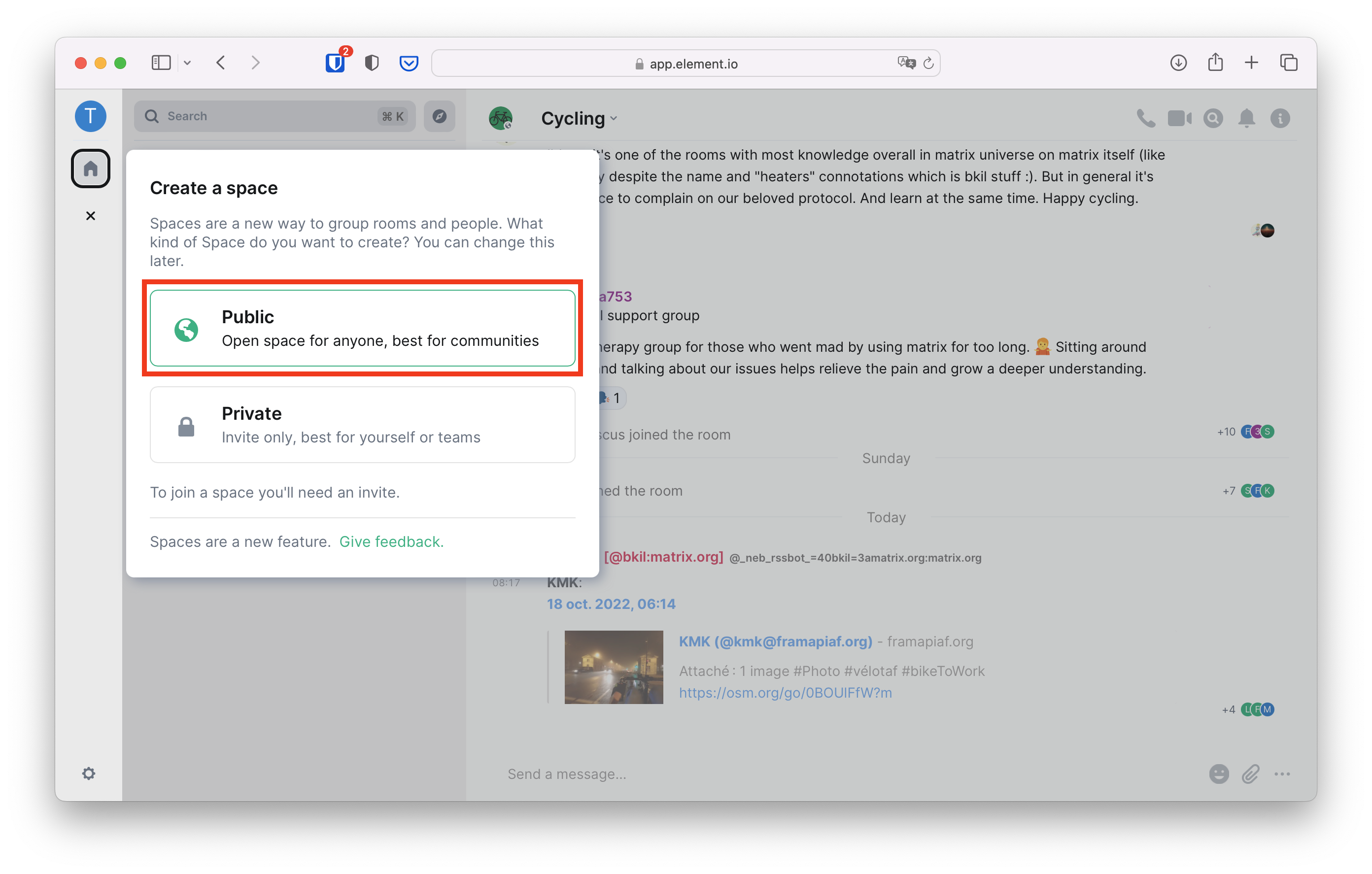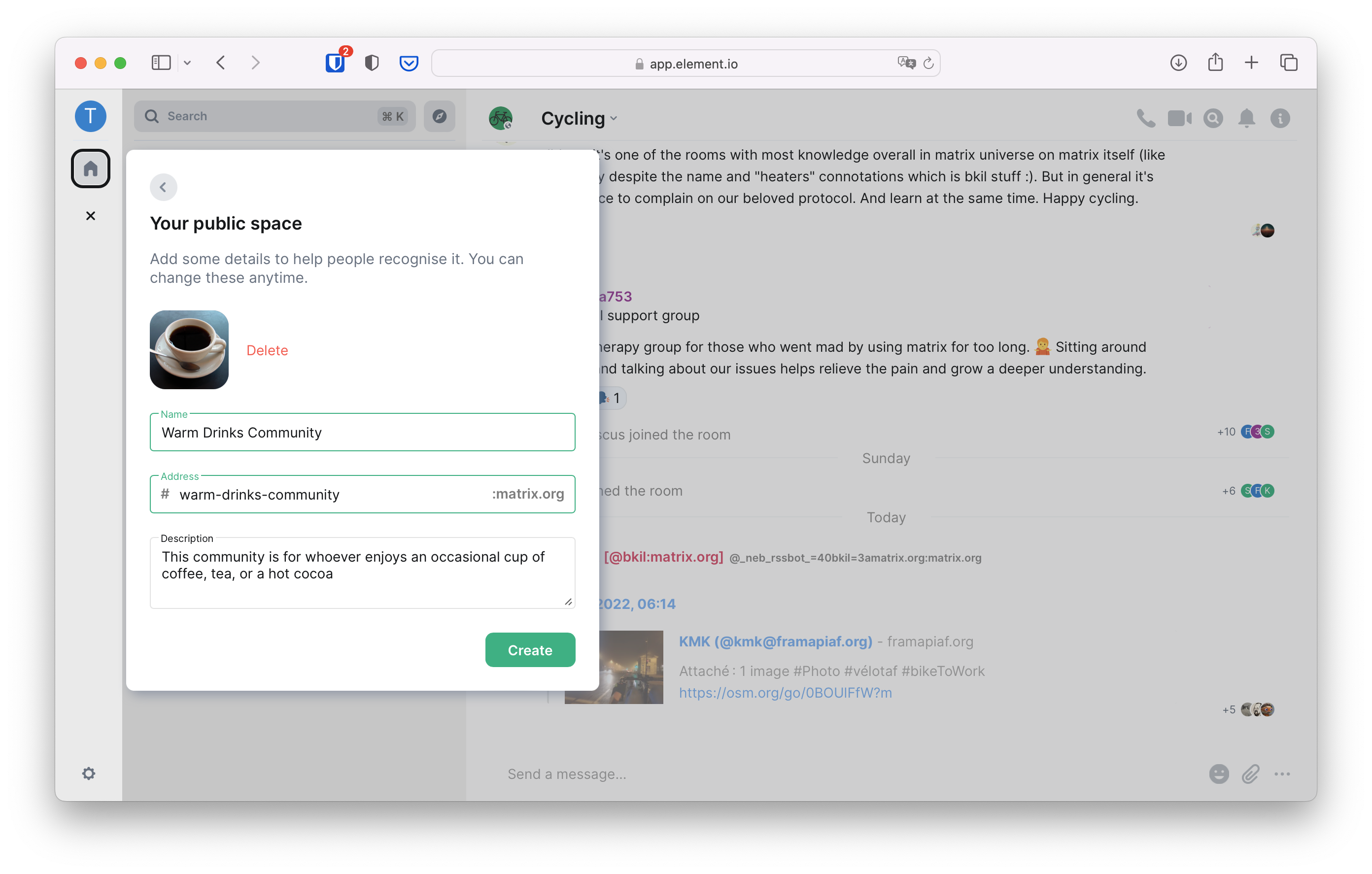 The first thing to do whether you are starting a new community or trying to bridge one to Matrix is to create a Space for it. You can think of Matrix Spaces as equivalents of Slack Workspaces, or Discord Servers. They're a way to group people and rooms.