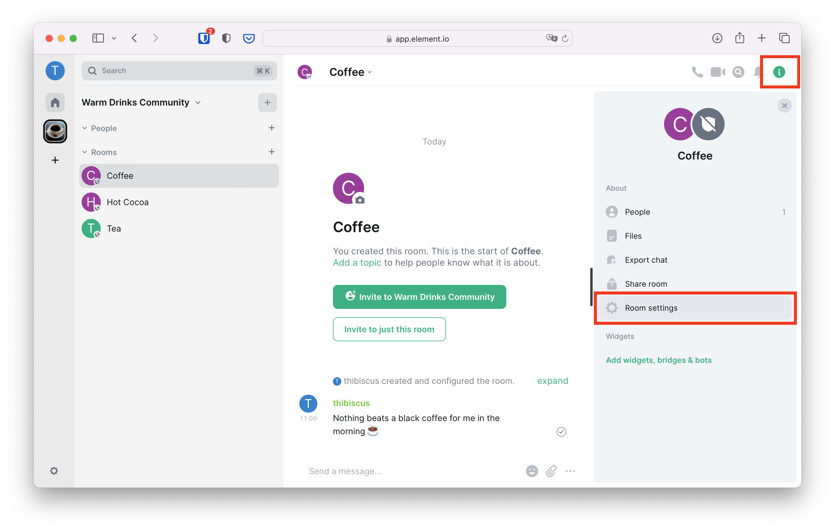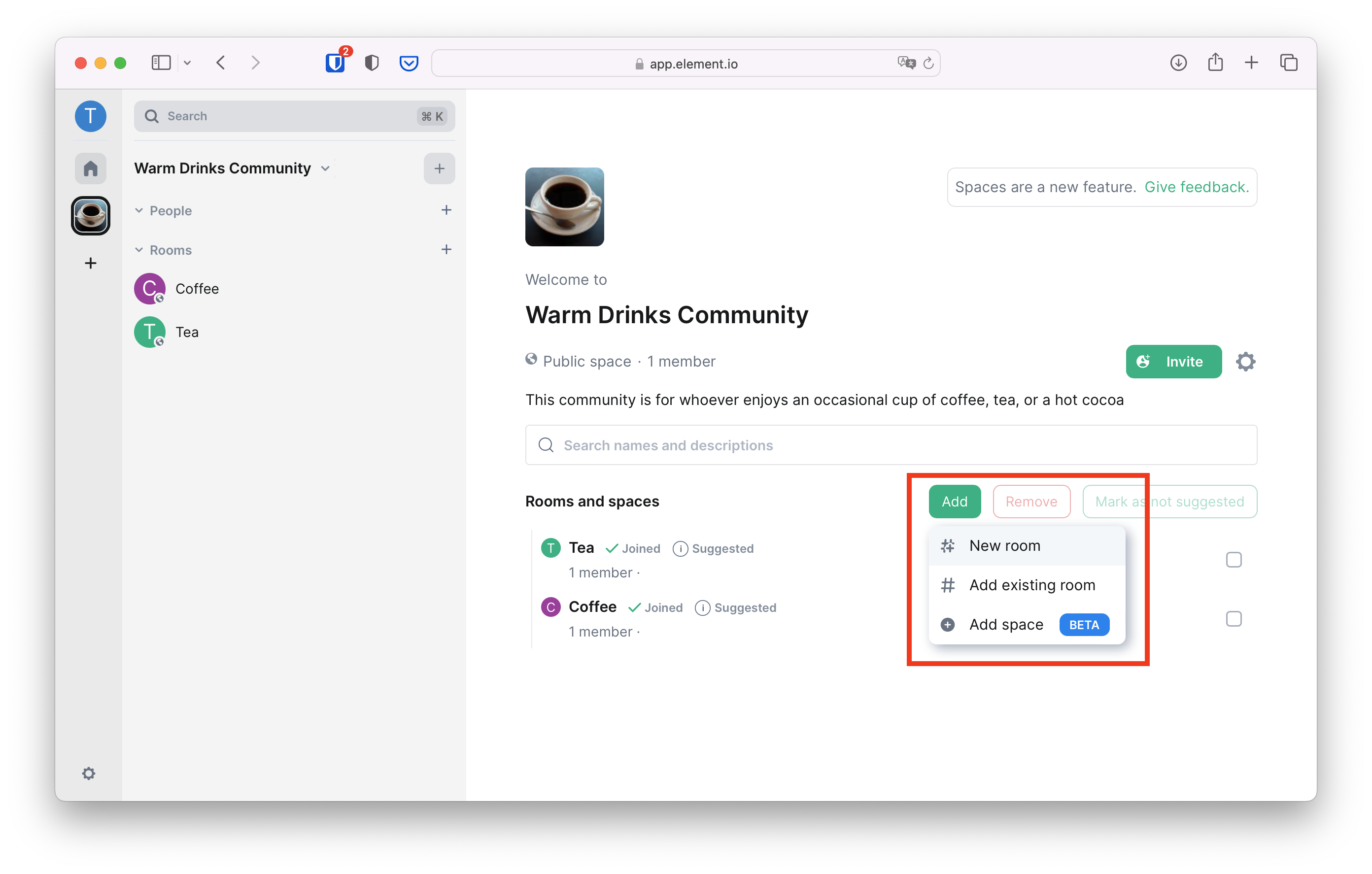 You can play around in the rooms, but look! We forgot to create a room for people who enjoy hot cocoas! Click on the Space avatar in the left bar to go to the Space's index