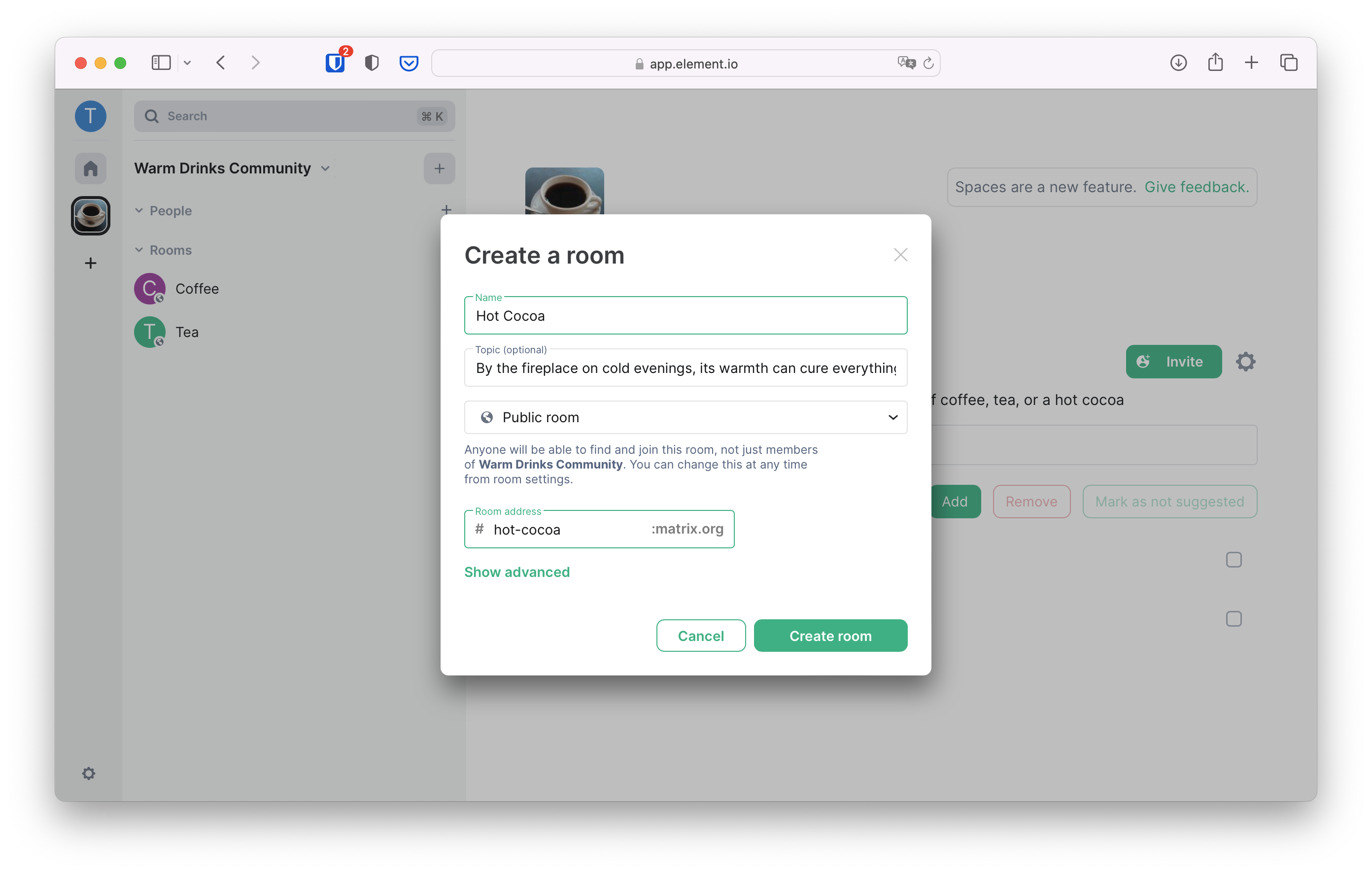 You can then add a couple of rooms to get started with the basics... and voilĂ , you now have a community on Matrix!