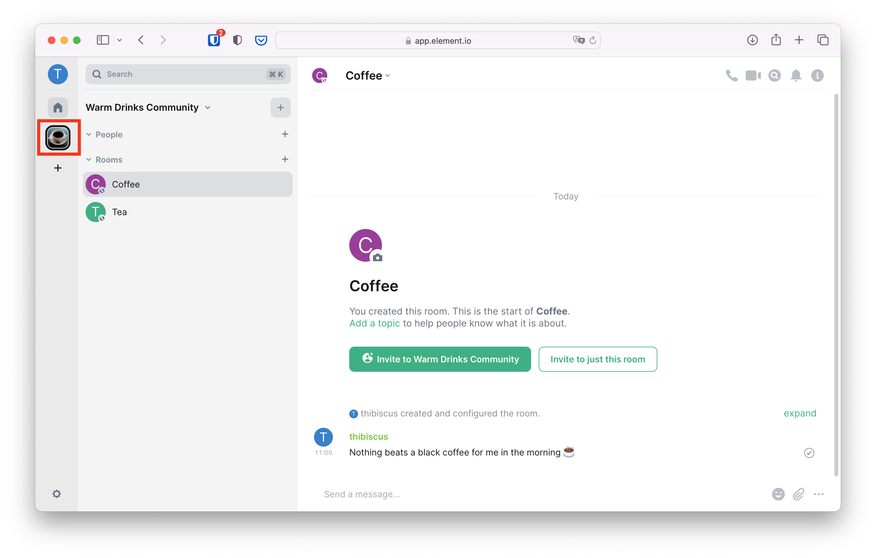 You can play around in the rooms, but look! We forgot to create a room for people who enjoy hot cocoas! Click on the Space avatar in the left bar to go to the Space's index